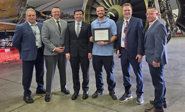 U.S. Deputy Secretary of Labor Keith Sonderling (third from left) presents AAR team member Nicolas Alvarez (fourth from left) an apprenticeship program certificate of completion on February 19, 2026, at AAR’s Airframe MRO facility in Miami. Leaders from AAR join the celebration of the apprenticeship program’s success prior to hosting a roundtable discussion on developing the national workforce through apprenticeships.